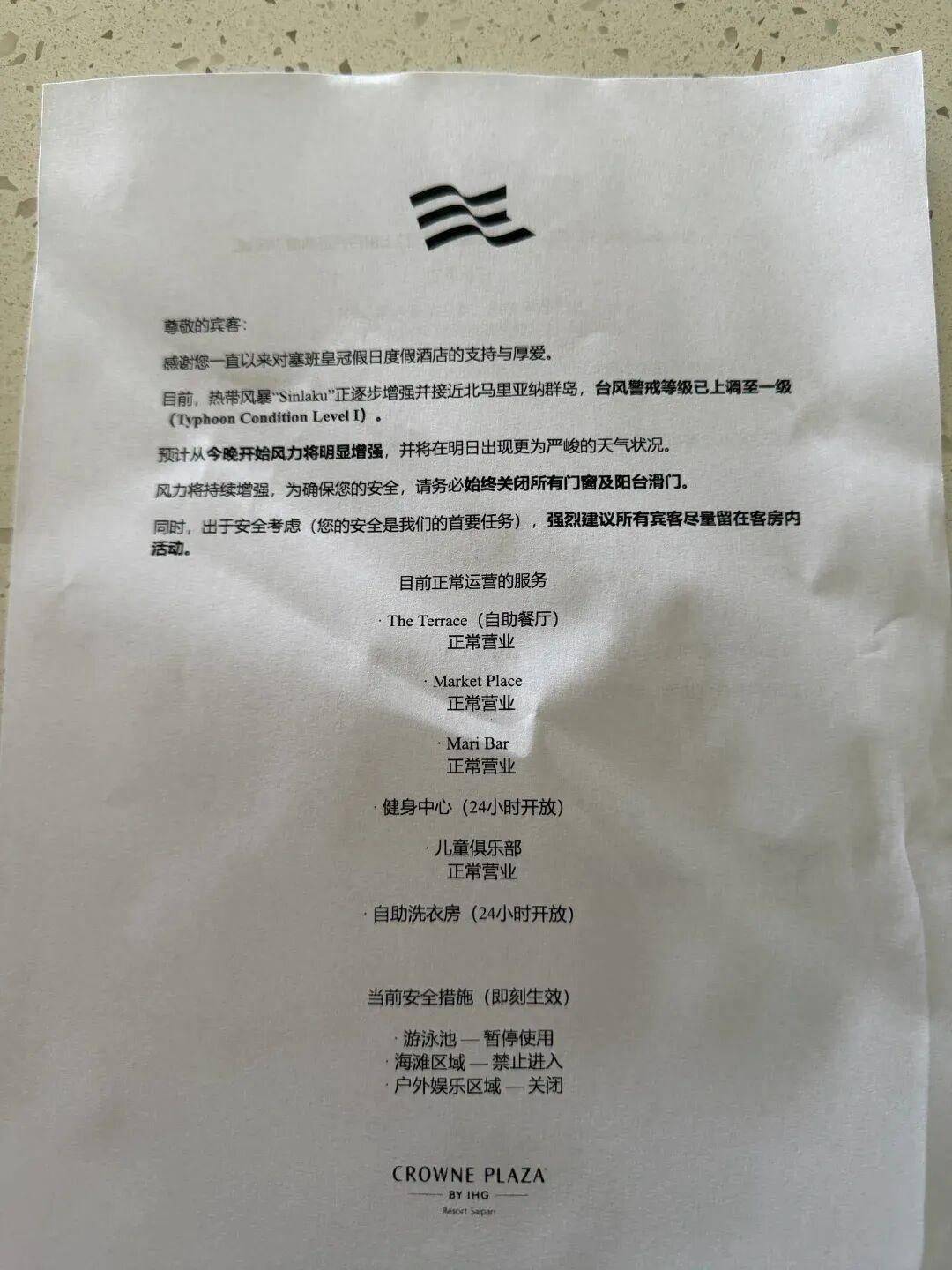 中午时分,天气阴沉,风力还只有三四级,但酒店大堂以及每层楼的玻璃窗户都已加上防护,游泳池、海滩区域以及户外娱乐区域已经关闭。“好在我们同一个酒店的中国游客建了一个互助群,大家一起分享最新的消息,也聊聊天,心情没那么紧张了。”