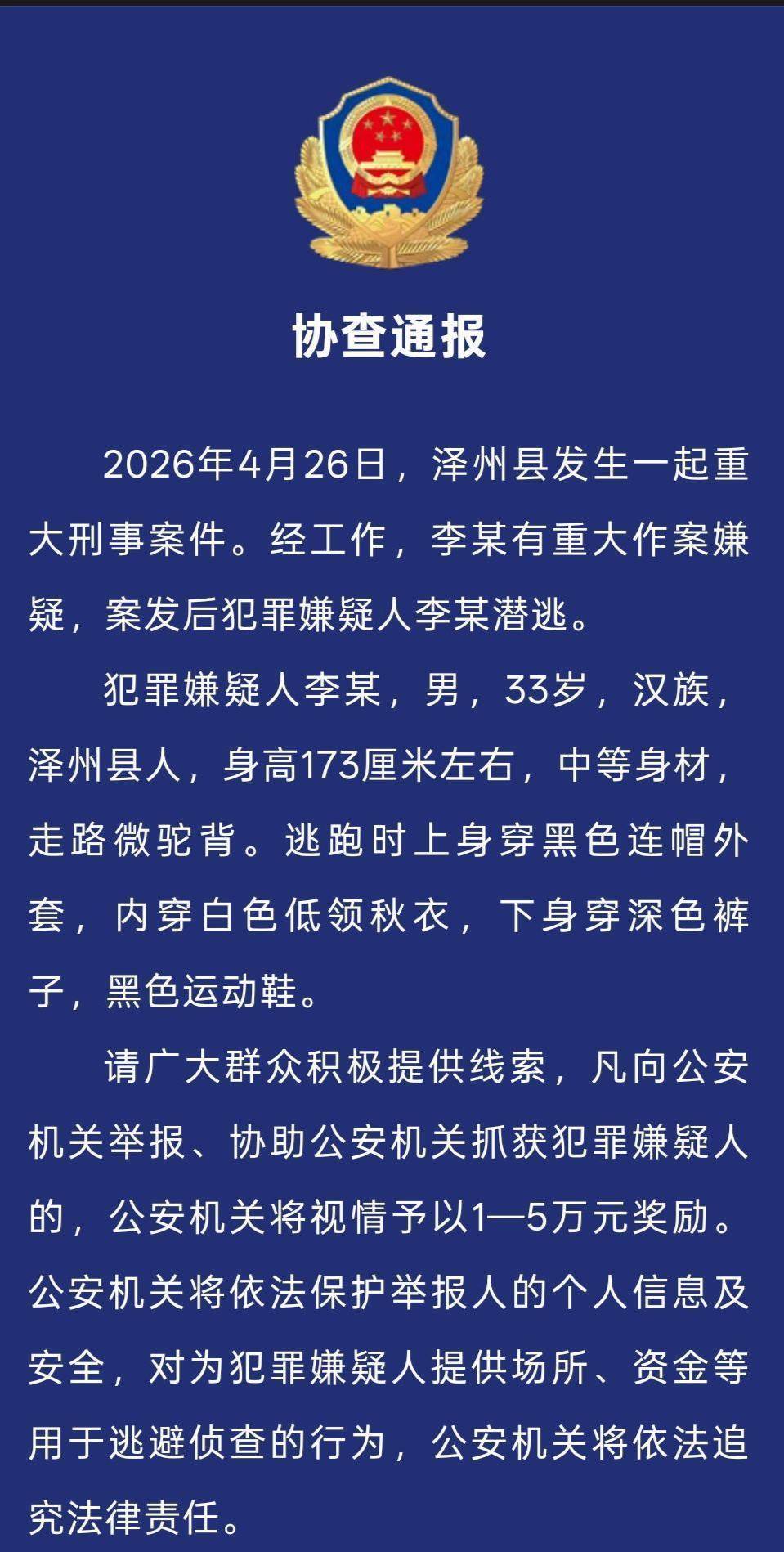4月27日,据平安泽州消息:2026年4月26日,泽州县发生一起重大刑事案件。经工作,李某有重大作案嫌疑,案发后犯罪嫌疑人李某潜逃。